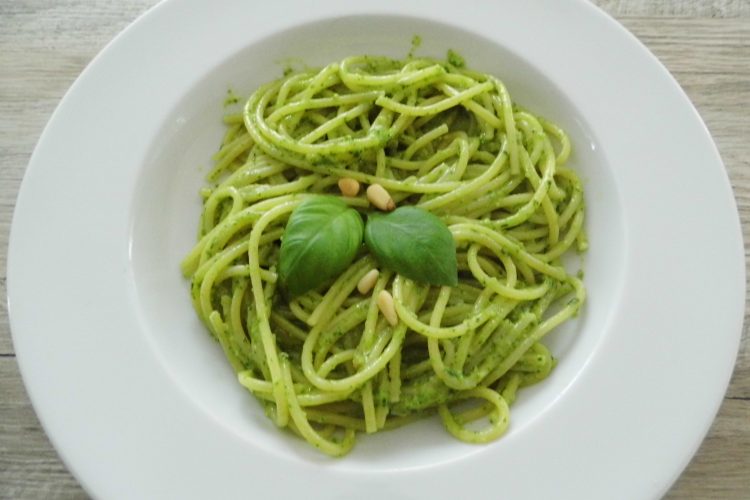 • Derweil die Basilikumblätter abzupfen, waschen und in einen Behälter geben. Olivenöl, Salz, Knoblaufzehe, den geriebenen Parmesan und die Pinienkerne hinzugeben und alles entweder mit einem Stößel oder dem Pürierstab zerkleinern und vermischen.